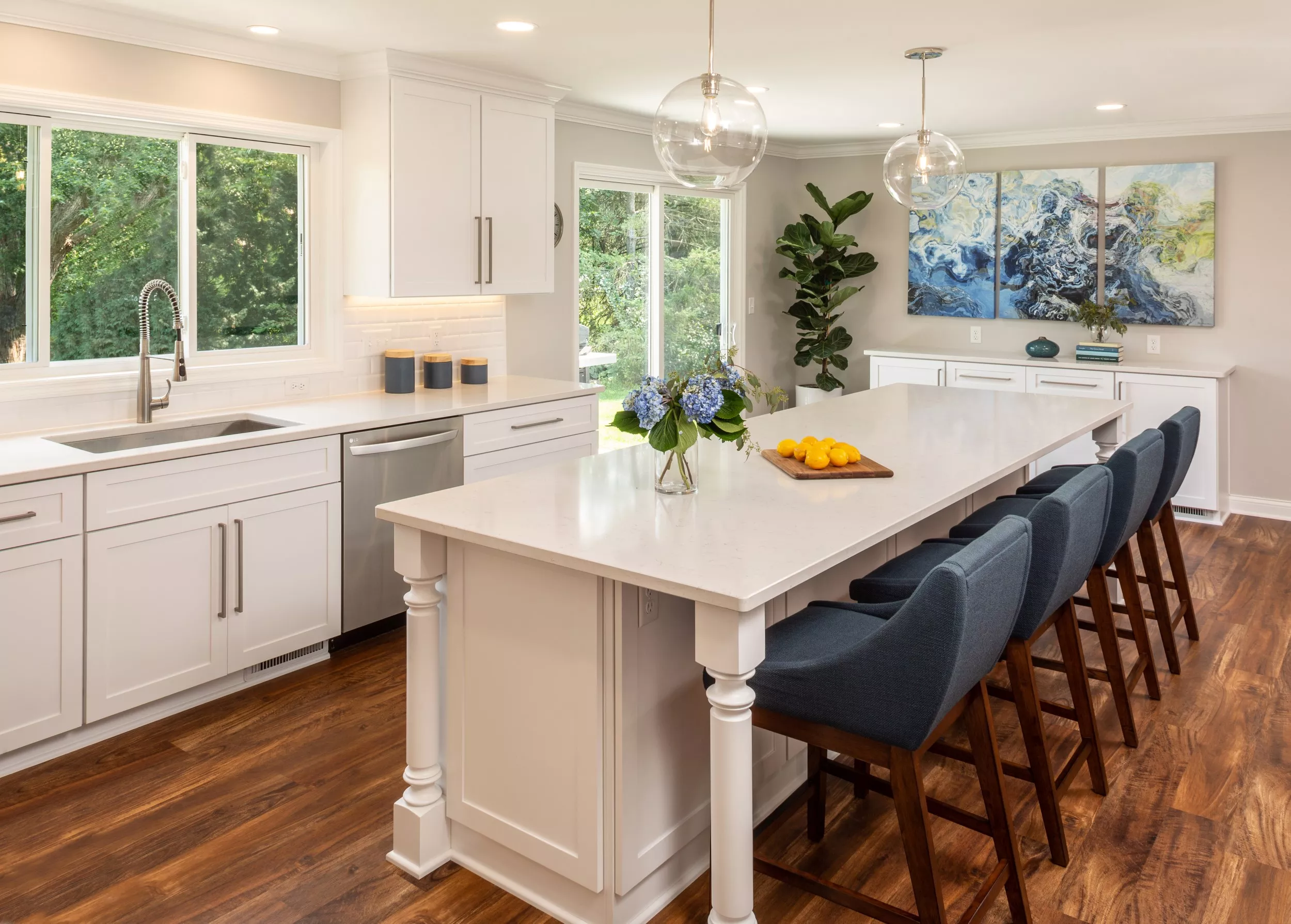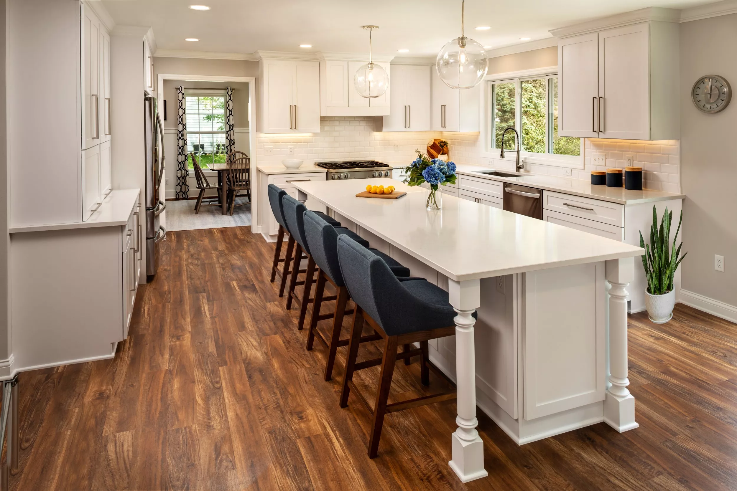 To support the family’s needs, every material was chosen with intention. Quartz countertops provide durable, low-maintenance beauty. Luxury vinyl plank flooring withstands daily wear from children and pets without sacrificing style. LED recessed lighting and pendant fixtures illuminate work zones and offer flexibility in both mood and ambiance.