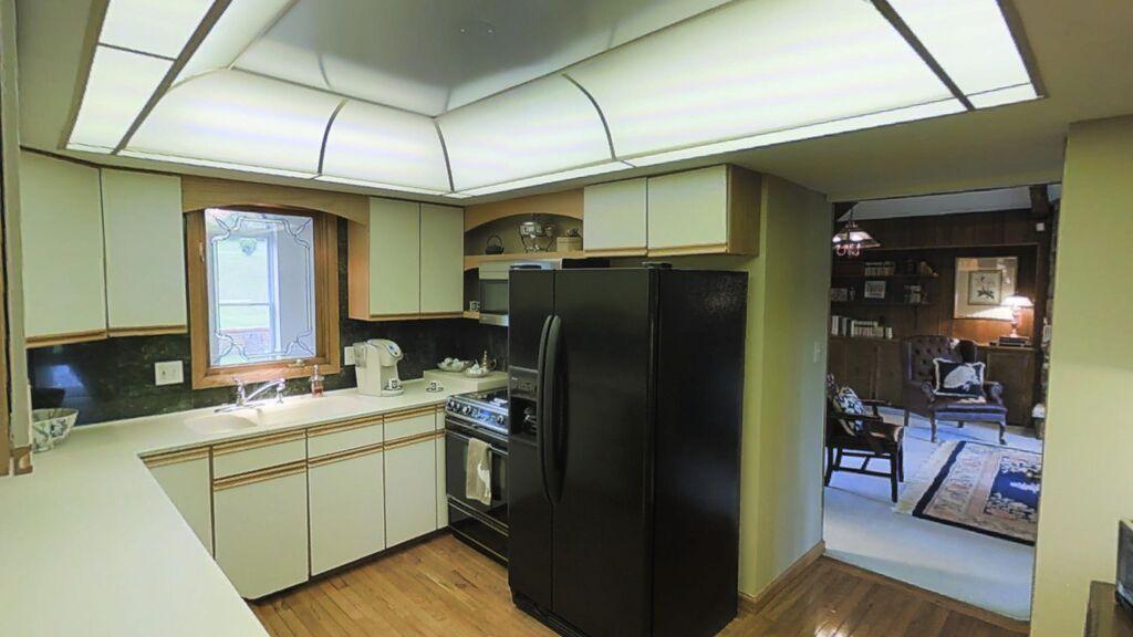 The kitchen and dinette were once separated by dark, paneled walls and a fluorescent tray ceiling that closed off the space. By removing multiple walls between the kitchen, family room, and dining areas, we created an open concept that brings light and life to the heart of the home.