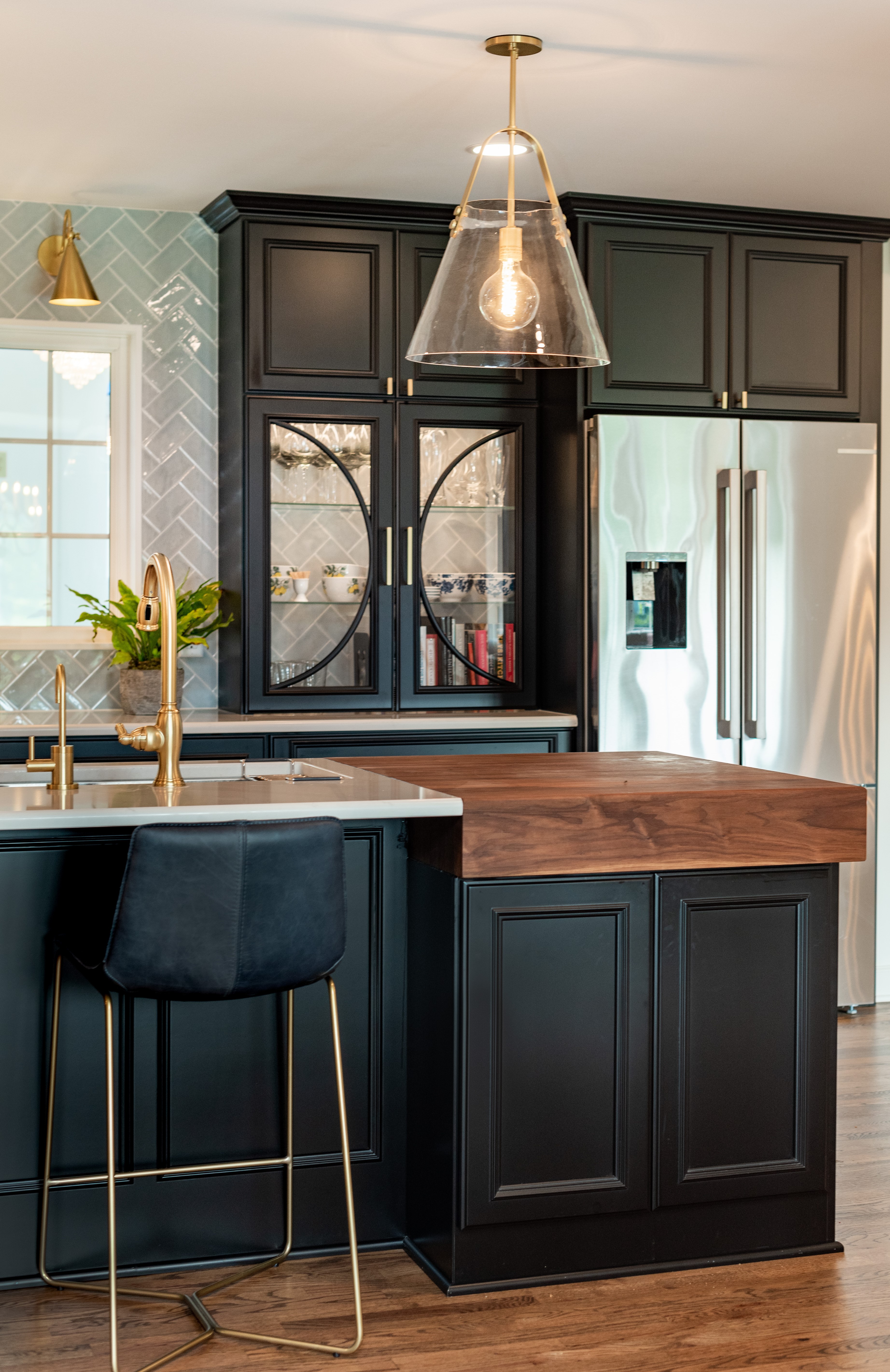 This remodel showcases precision and purpose at every turn. Custom glass and metal mesh cabinet doors, full-height wainscoting, and a six-inch-thick walnut butcher block countertop demonstrate both artistry and skill.