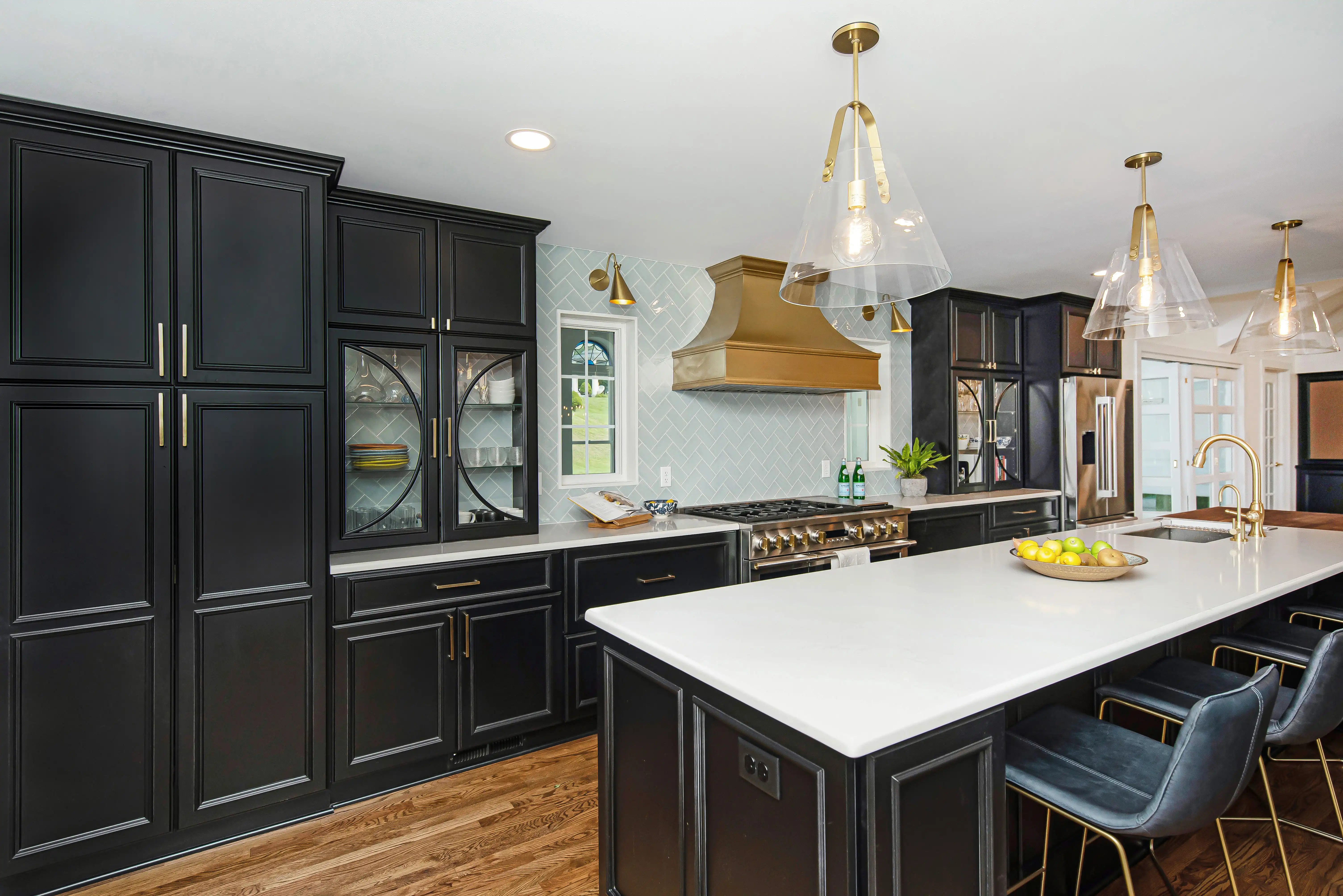 Every detail of this remodel was designed to bridge the past and present. Brass accents in lighting, hardware, and the range hood add warmth and grandeur, while black Seville cabinetry brings depth and drama. A soft French blue herringbone backsplash adds color and personality, carried into the breezeway with floor-to-ceiling wainscoting for a cohesive finish.