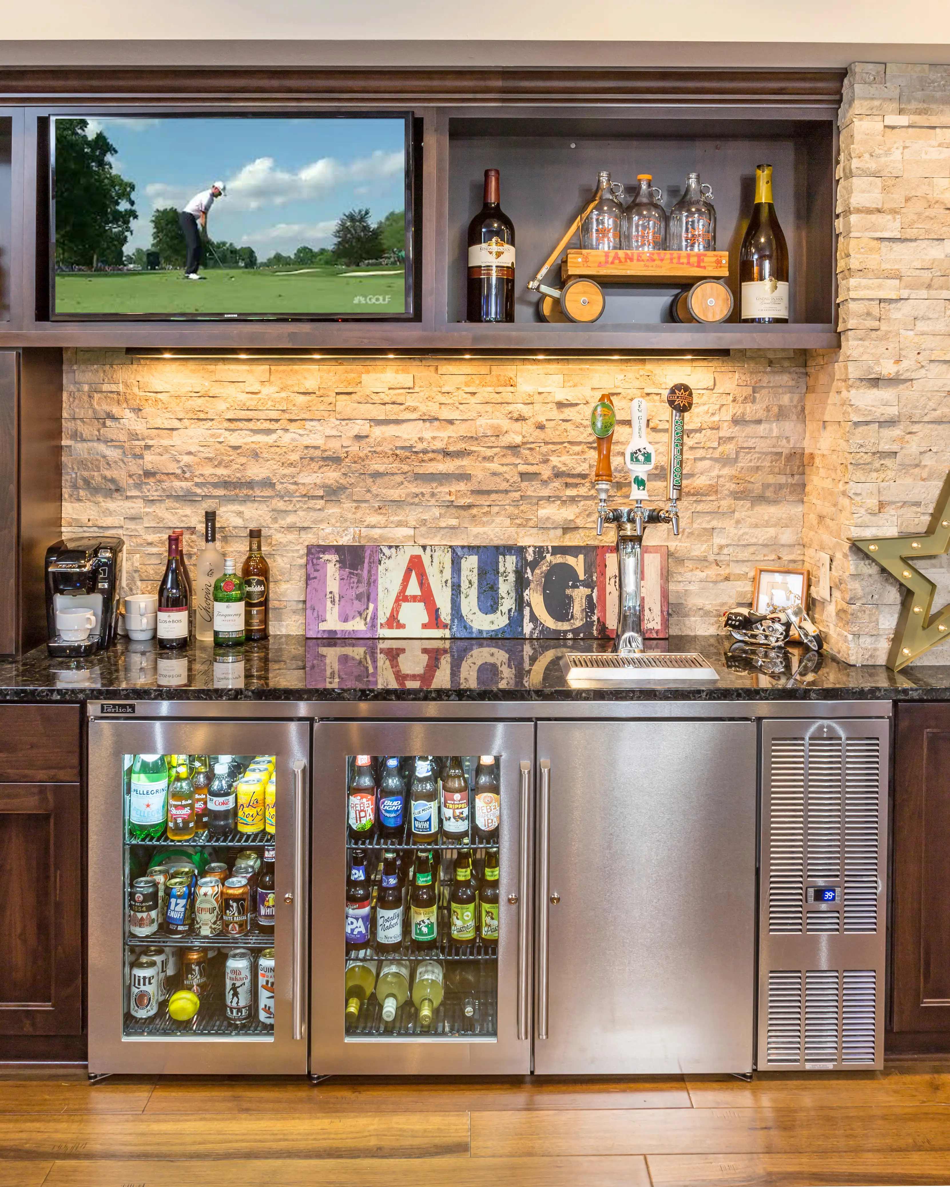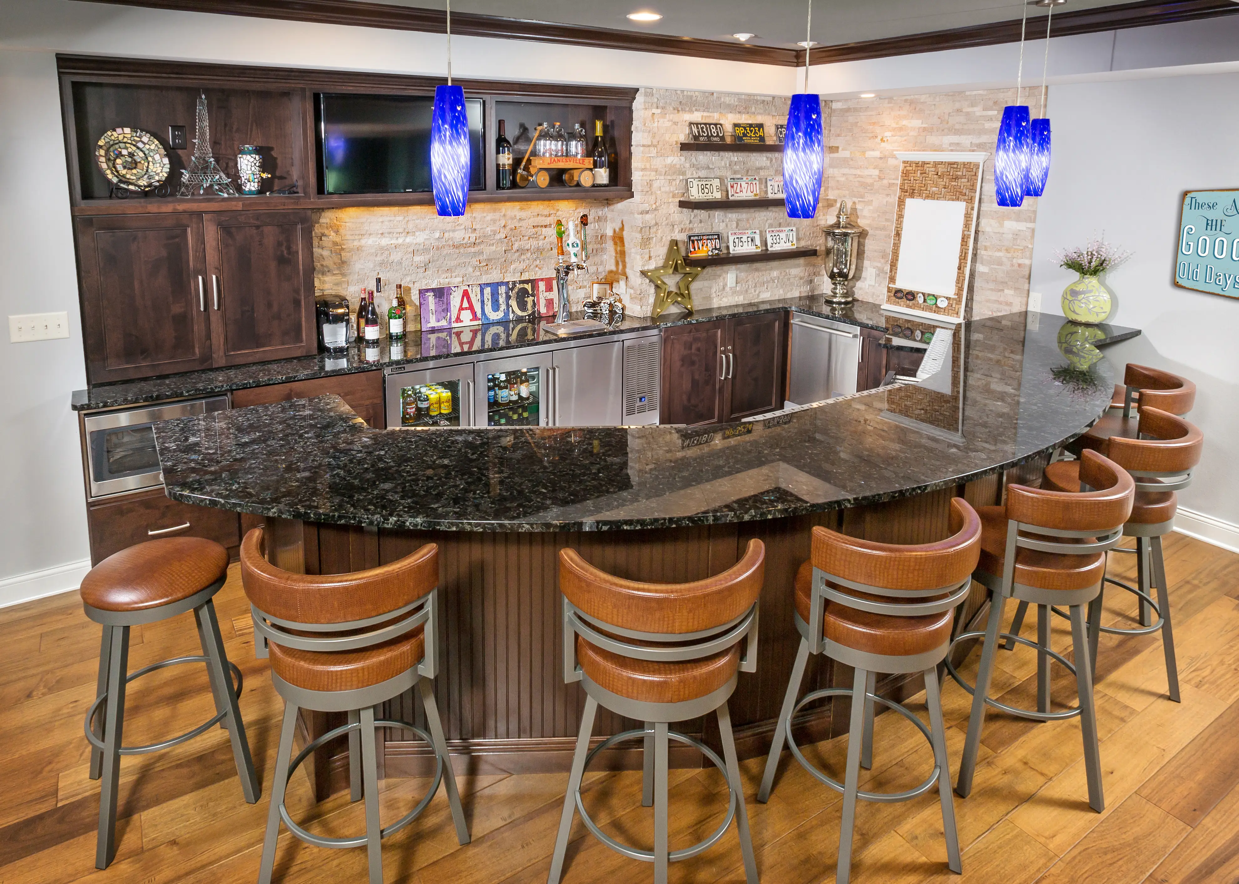 Appliances and cabinetry were custom-fit to the inch, supporting smooth transitions and efficient use of space. The layered lighting plan combines recessed, pendant, and under-cabinet fixtures to balance task and ambient lighting. Each choice helps the bar feel complete, personal, and ready to serve the homeowners for years to come.
