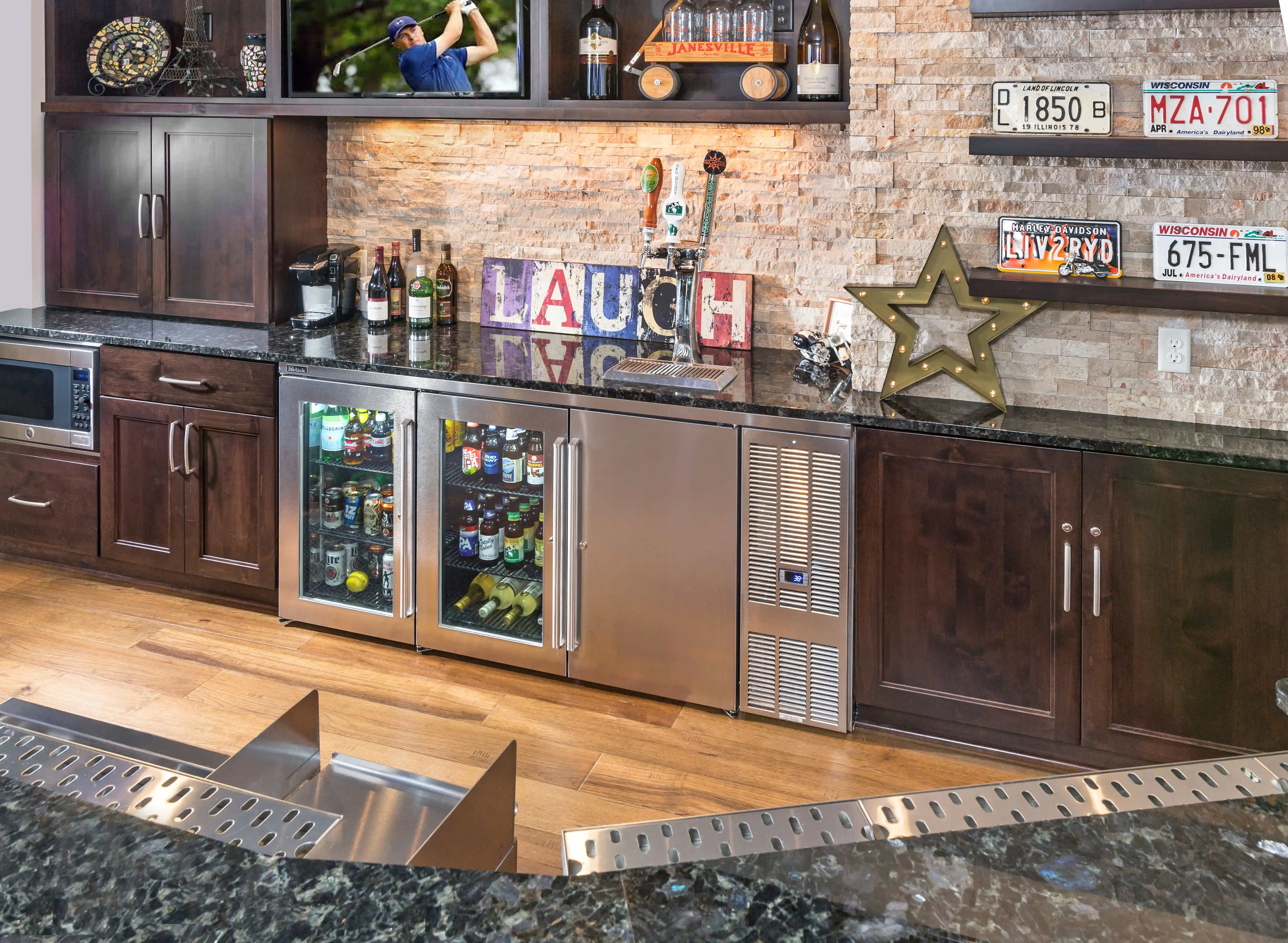 Perlick stainless steel appliances and underbar components support durability, sanitation, and ease of use. Low-maintenance materials and easy-to-clean surfaces make the space practical for regular gatherings. Whether they’re hosting a small group or a full room, the bar adapts effortlessly to the occasion.