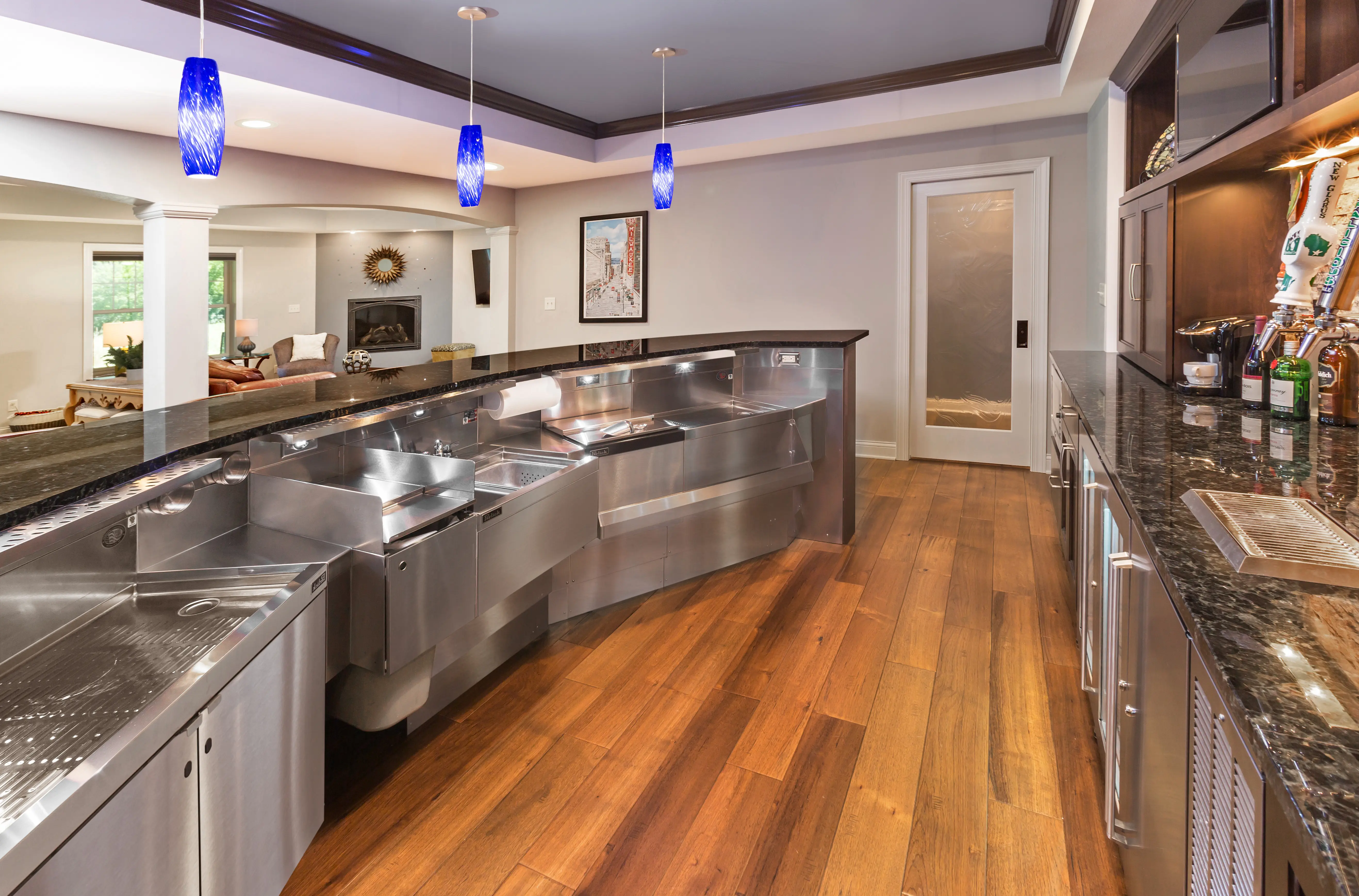 Natural materials soften the sleekness of stainless steel throughout the bar. A dry-stacked stone wall introduces warmth and texture, while Volga Blue granite adds subtle movement and depth. A coffered ceiling defines the bar area and conceals structural elements, creating an intimate feel within the lower level.