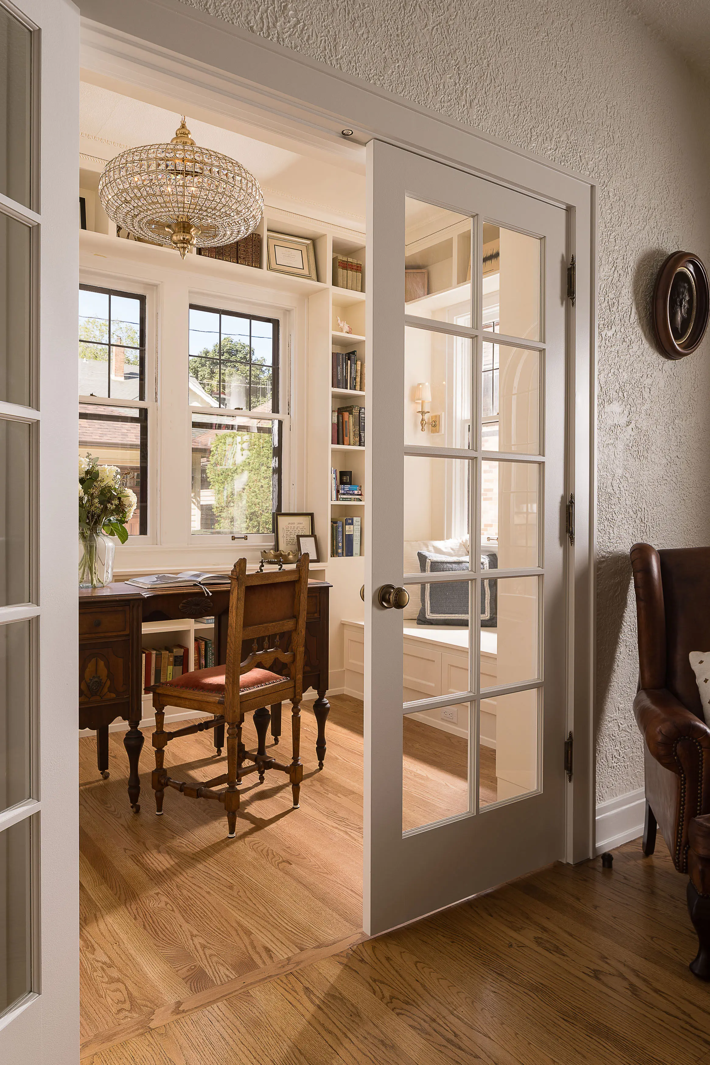 The addition of a gas fireplace transformed what was once a quiet sitting room into a true family gathering space – warm, comfortable, and practical for every season. French doors now separate the office, offering privacy for work or reading while maintaining a visual connection to the rest of the home.