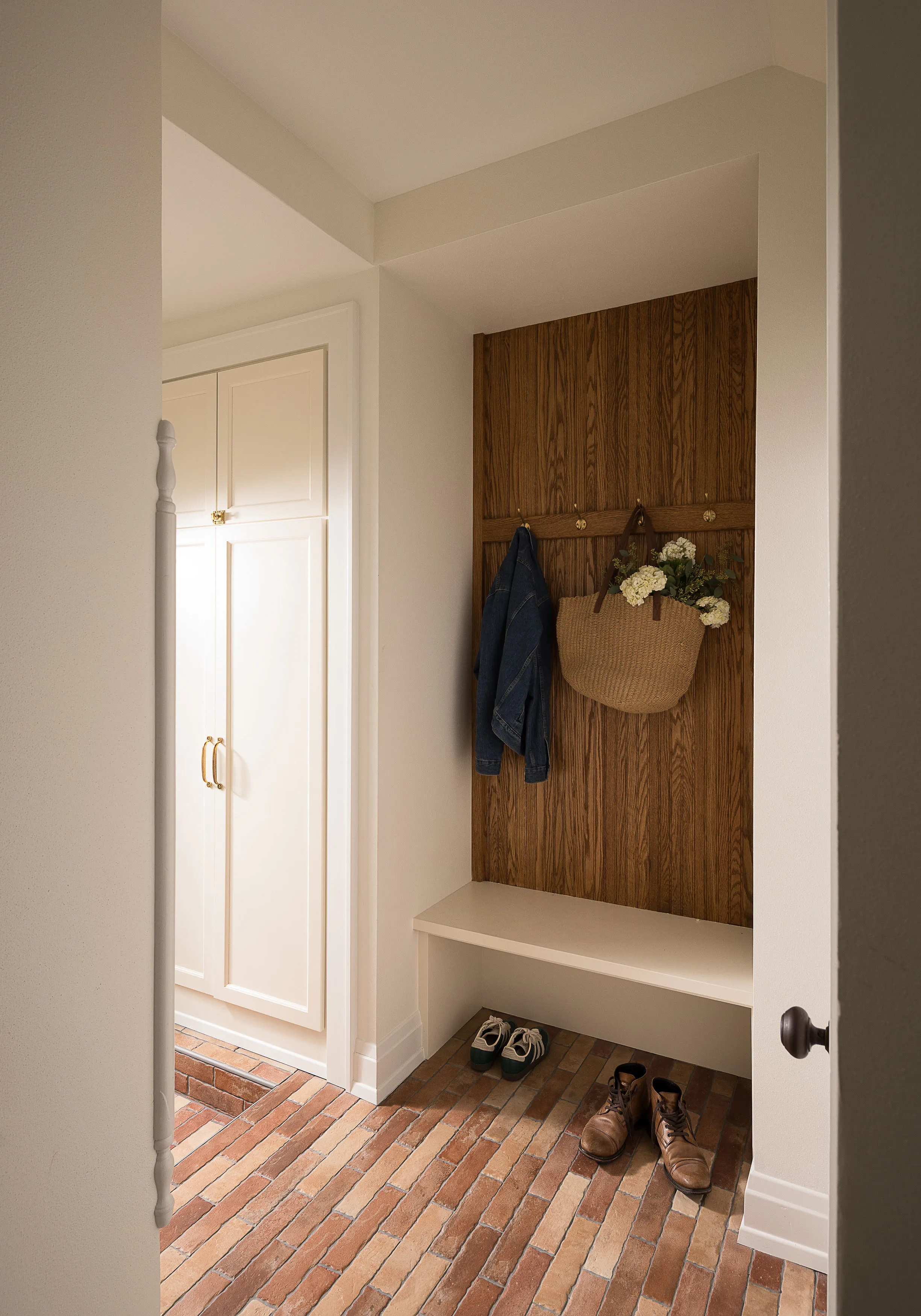 Previously, the floor plan lacked a defined entry or storage area. The new design introduced a recessed drop zone complete with a bench and coat closet, creating a natural transition as you enter the home.