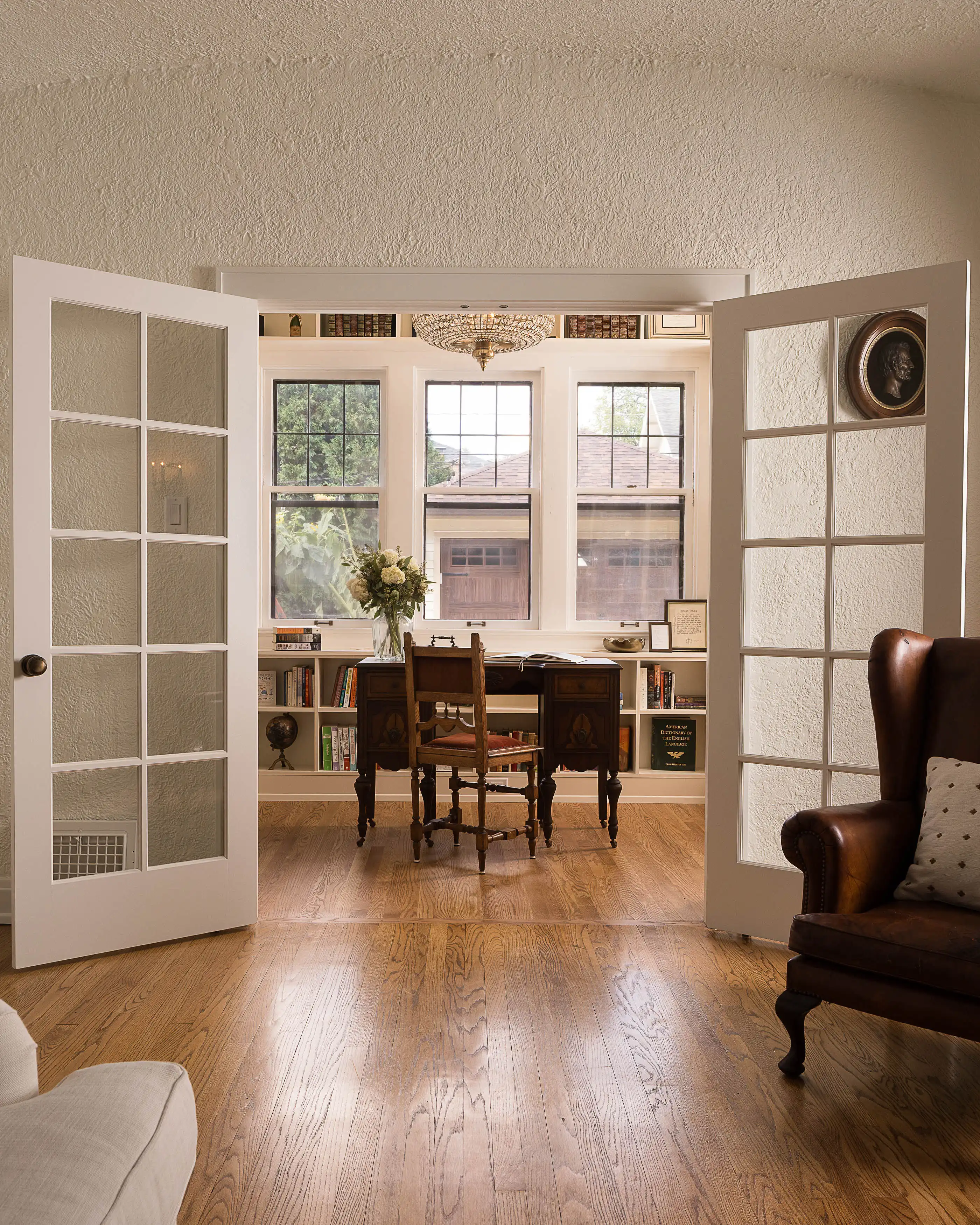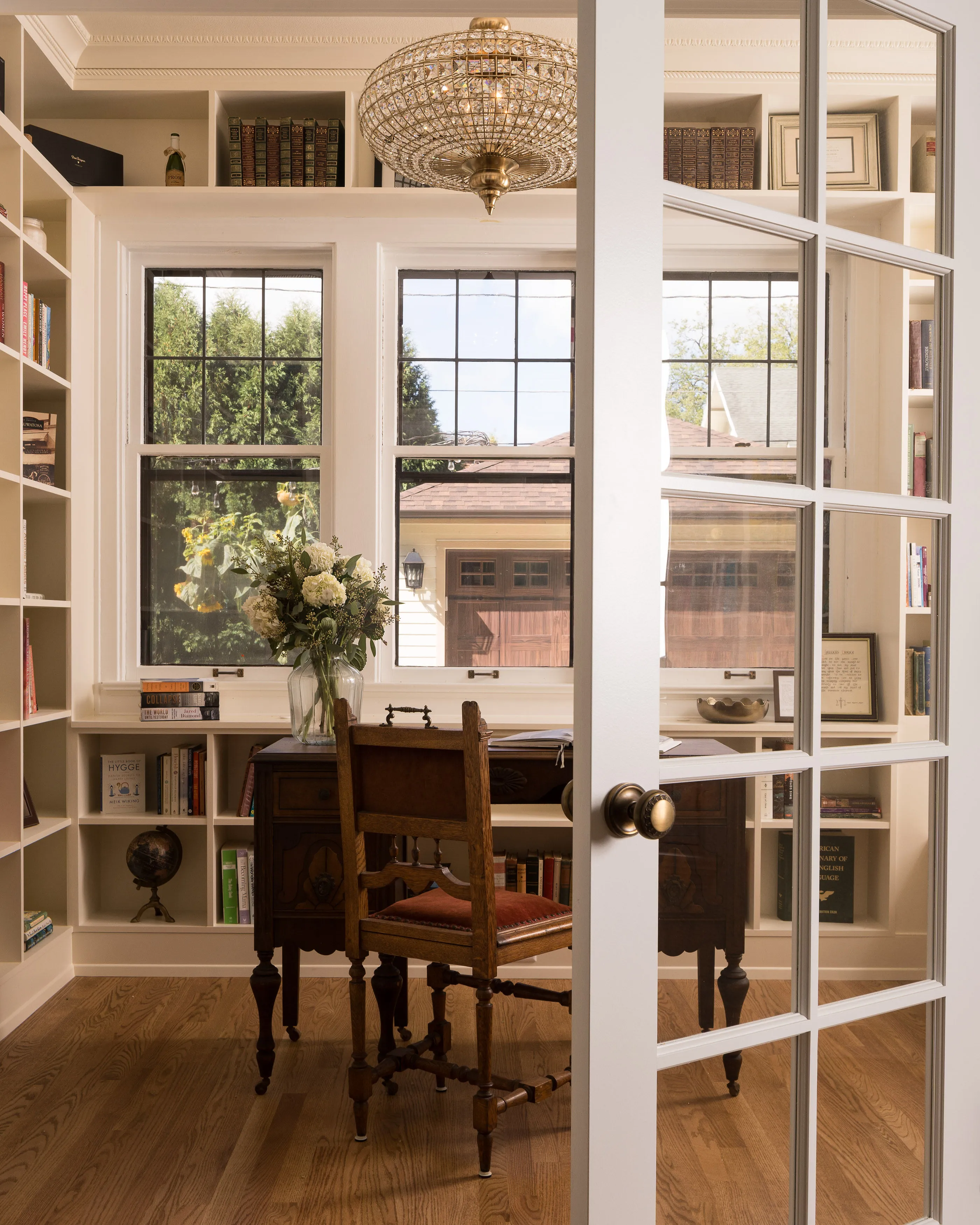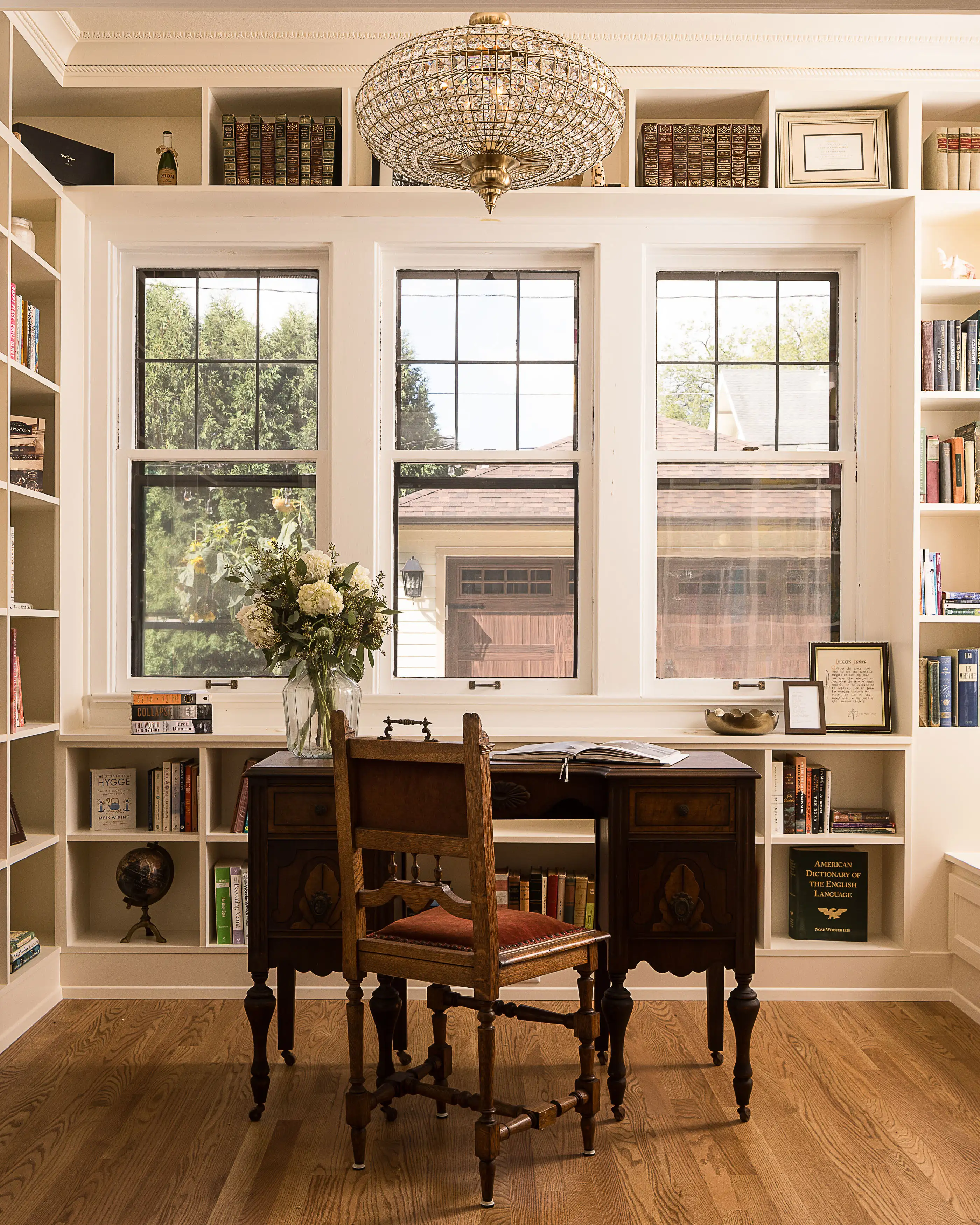 New oak flooring was added to the office and library to extend naturally from the existing hardwood, ensuring the transition between rooms feels cohesive and intentional. The result is craftsmanship that enhances the home’s story while offering the durability of modern construction.