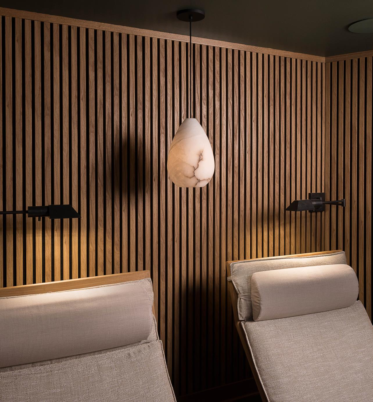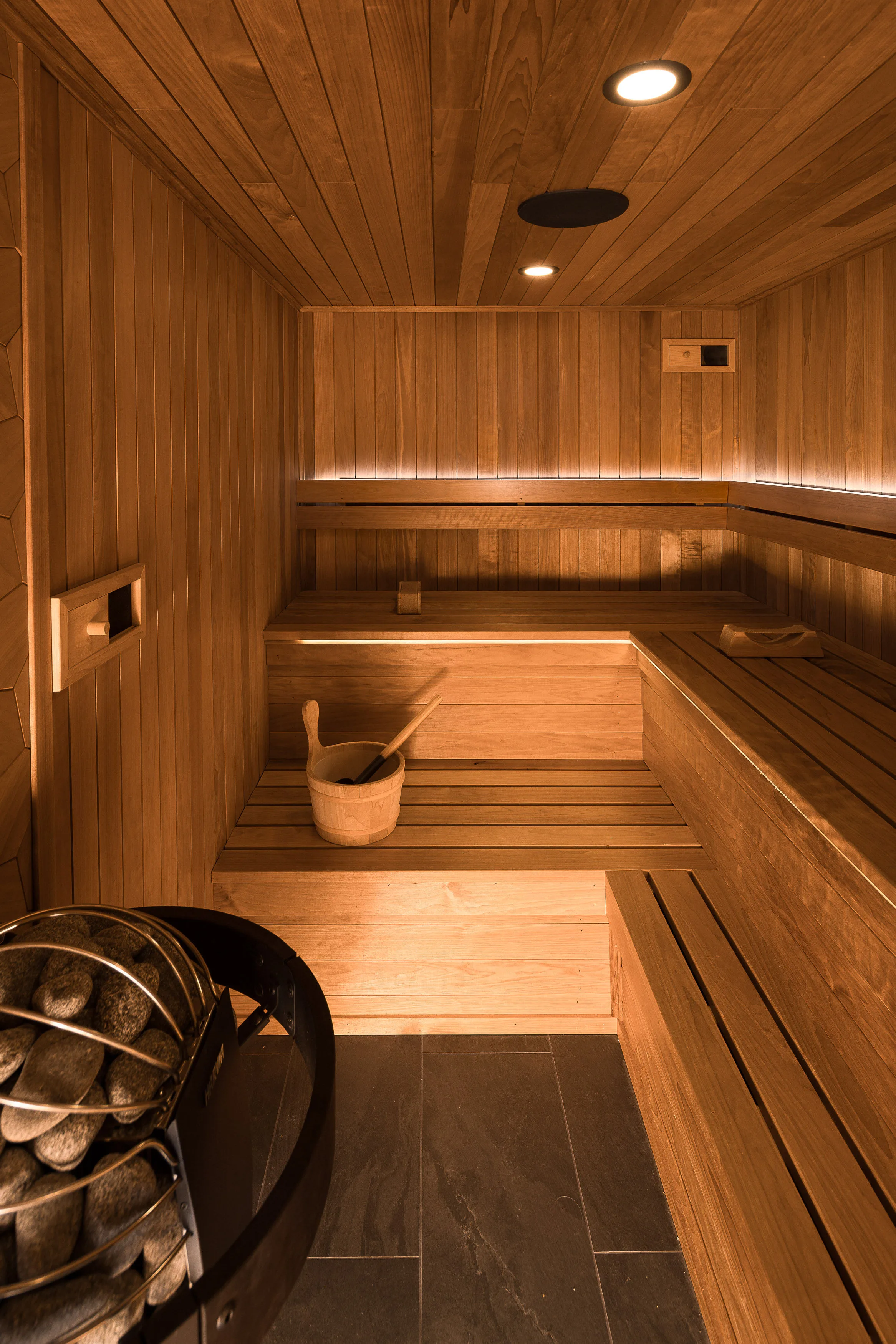 Innovation shaped both the design and the construction process. The spa includes WoodUp vertical acoustical panels that add texture, warmth, and sound control for a peaceful retreat. The Harvia Spirit heater, crafted in Finland, brings form and function together with a sculptural, wall-mounted design and rounded stones that elevate the sauna experience.
