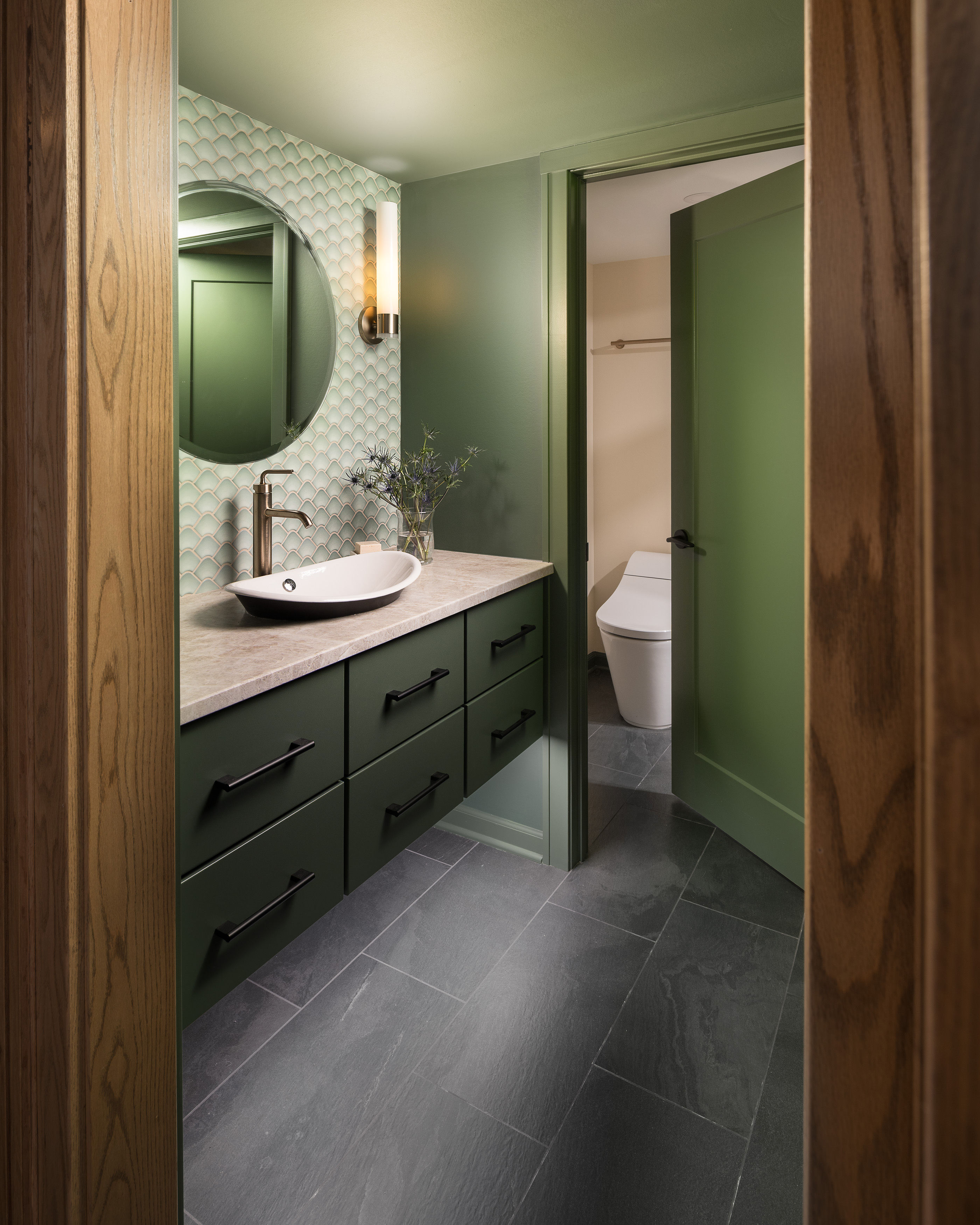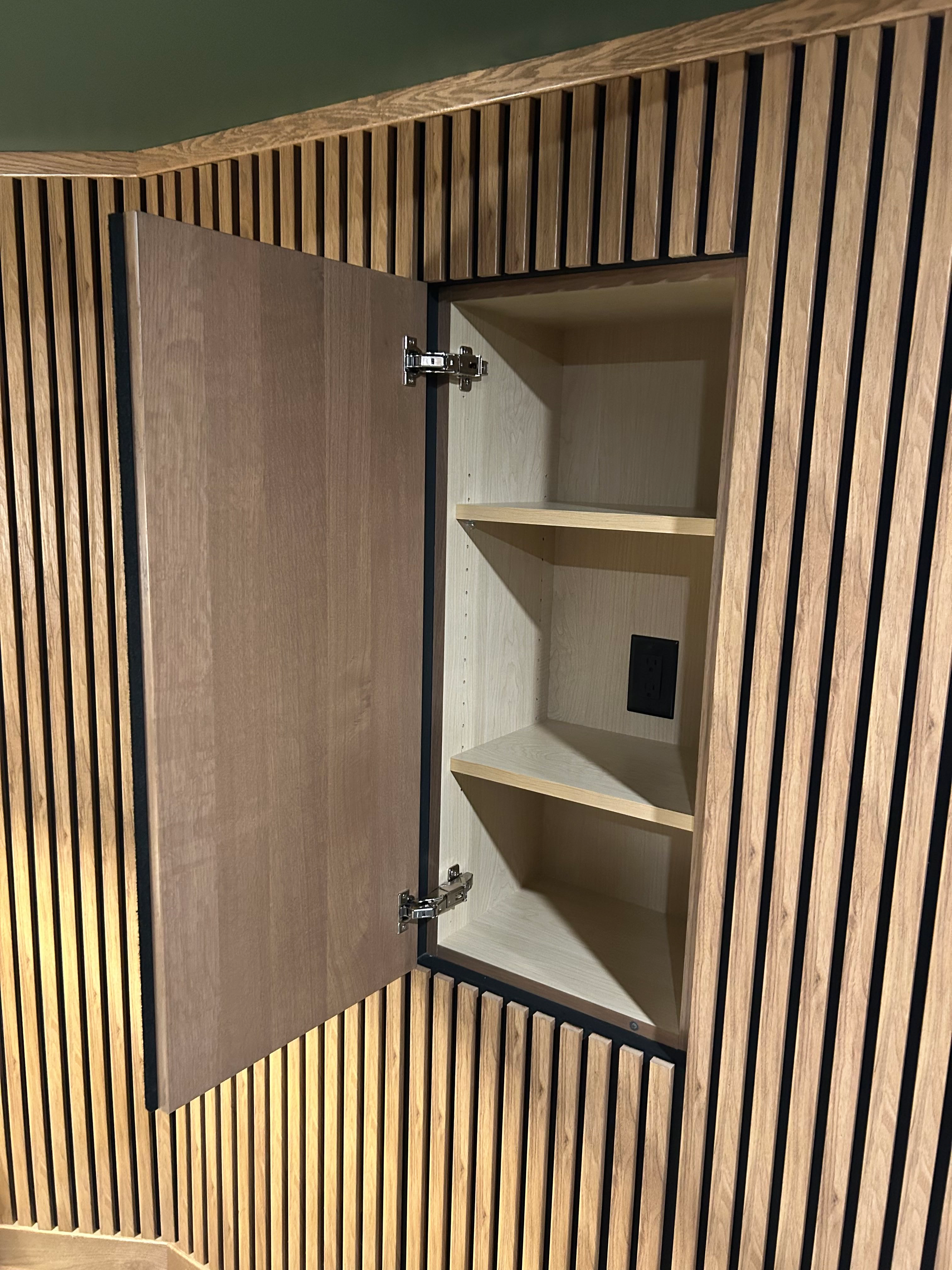 Craftsmanship is at the heart of this remodel. Nowhere is it more evident than in the spa and sauna, where carpentry and technical precision come together to create a peaceful, immersive environment. Vertical slat walls hide doors and compartments within seamless lines, while the sauna — crafted in Finland — was installed with careful attention to detail in a challenging alcove beneath the front stoop.